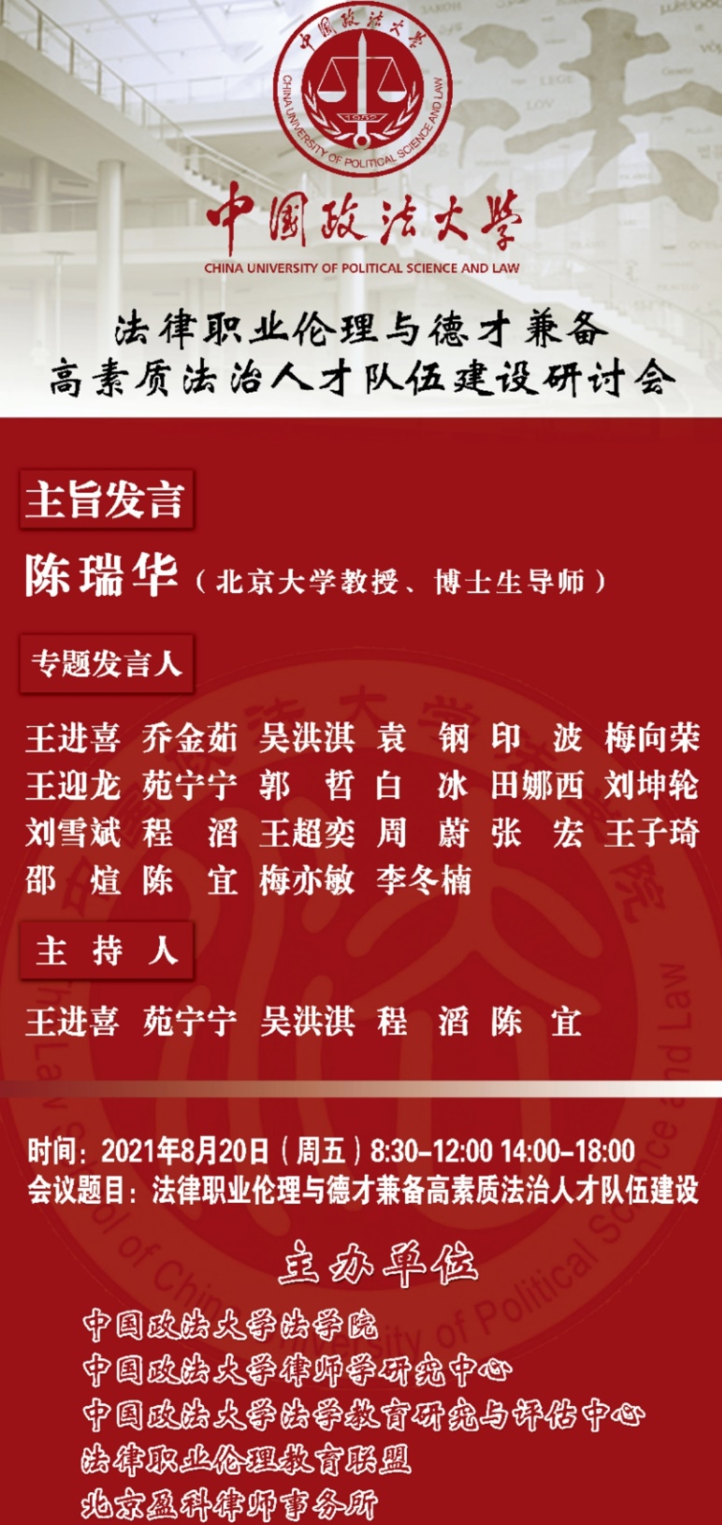 2021年8月20日,日本AV 法学院印波副教授参加了“法律职业伦理与德才兼备高素质法治人才队伍建设”研讨会,本次研讨会由中国政法大学日本AV 、律师学研究中心、法学教育研究与评估中心、法律职业伦理教育联盟、北京市盈科律师事务所共同举办。来自北京大学、中国政法大学、日本AV 、湖南大学、吉林大学、北京工商大学、河南财经政法大学、北京盈科律师事务所等单位的专家共计190余人在线上参与了本次会议。