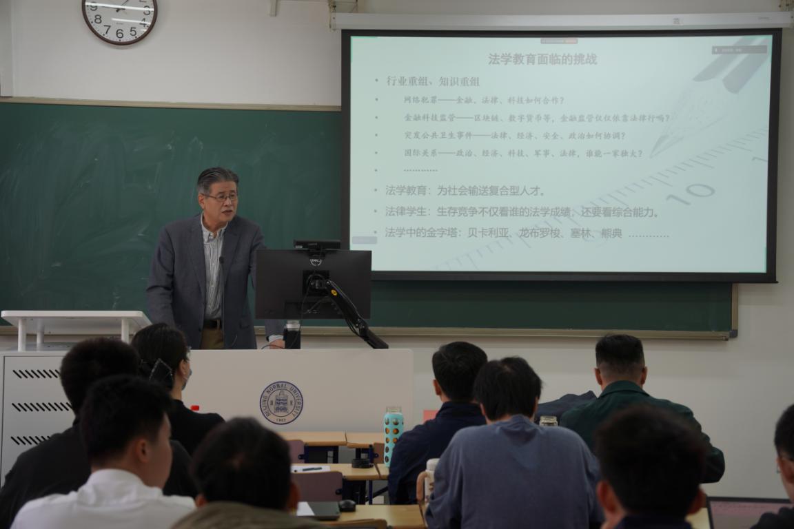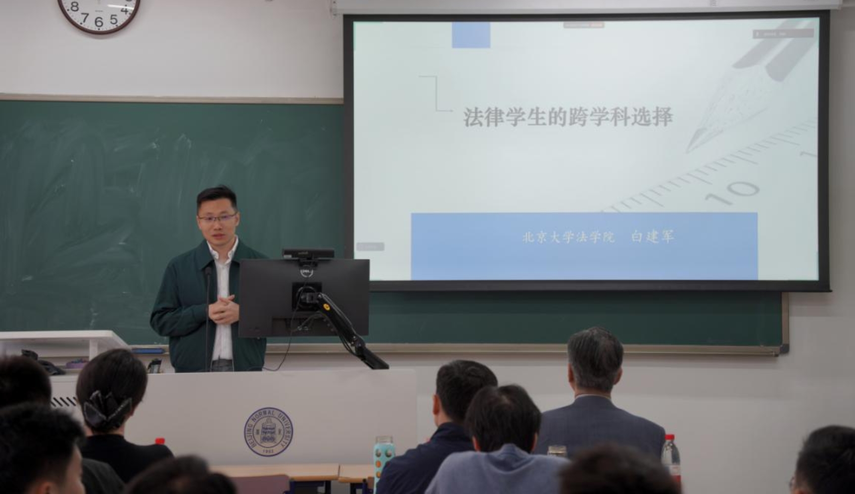 白建军教授首先从法学教育面临的挑战出发,强调了跨学科思维与研究在当下的重要意义。接下来,白老师结合自身研究经历,依次从“法学内各学科间的交叉融合”与“法学与其他学科间的交叉融合”两方面具体展示法学领域应该如何跨学科,最后,白老师以“资产=负债+股本”比喻学术资产的计算方式,鼓励同学们提升自己的跨学科能力。讲座深入浅出,引人入胜,赢得在场老师和同学的热烈掌声。