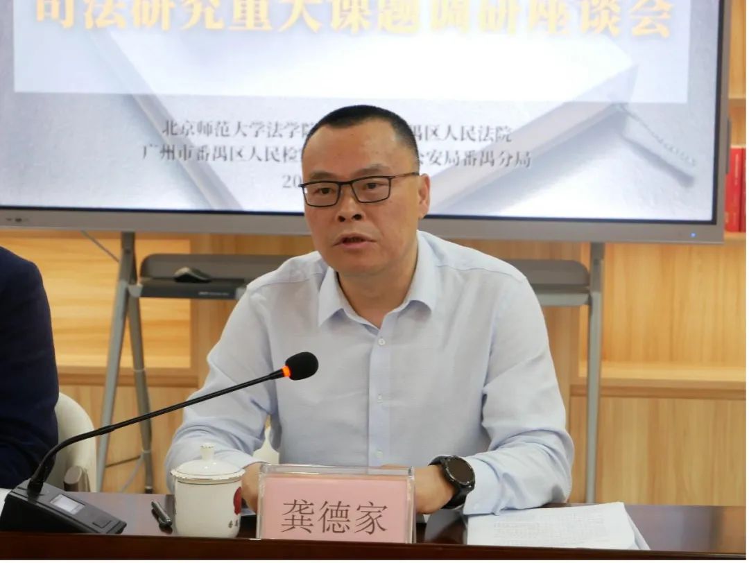 3月17日,阴建峰教授携课题组一行前往广州市番禺区人民法院调研,调研座谈会由番禺法院刑庭庭长章莹主持,区法院院长龚德家、副院长黄泽辉,区检察院检察长陈宏,区公安分局副局长谢建功,以及来自区公检法机关的十余人参与了本次调研活动。调研以座谈结合问卷调查的方式进行,主要围绕番禺区赌博案件特点趋势、公检法机关协同治理、相关罪名的界限、涉赌人员分类处理与行刑衔接、量刑标准的统一协调、跨省案件协作办理等内容开展。座谈会上,区公检法相关部门负责人结合具体数据和典型案例,全面介绍了番禺区赌博犯罪专项治理工作情况及经验做法。随后,阴建峰教授对该课题的理论与现实背景及北师大日本AV 的办学特色作了介绍,对交流环节实务共性问题进行了解读,并进一步表达了未来加强校地合作共建教学实践基地的意愿。最后,番禺区法院院长龚德家作总结讲话,对课题组一行的到来表示欢迎,肯定了课题组将理论研究与一线实践相结合,聚焦解决基层办案所急所需的务实精神,提出后续将通过学术交流、专业实习、邀请专家学者授课等方式进一步密切双方合作,早日推动教学实践基地的签约挂牌。