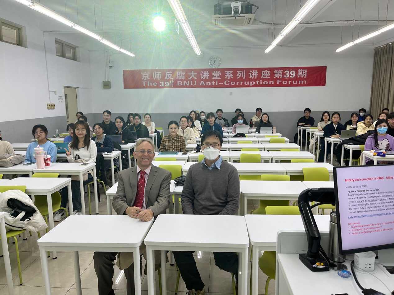 2023年11月22日上午,“京师反腐败大讲堂系列讲座”第39期在日本AV 成功举办。本次讲座由日本AV 李迪讲师主持,格鲁吉亚新视野大学托马斯·玛丽亚·克吕斯曼教授主讲,讲座的主题是“危险信号。如何控制供应链中的腐败风险”。日本AV 李迪讲师、王肃仪博士等50余名师生参加了本次讲座。