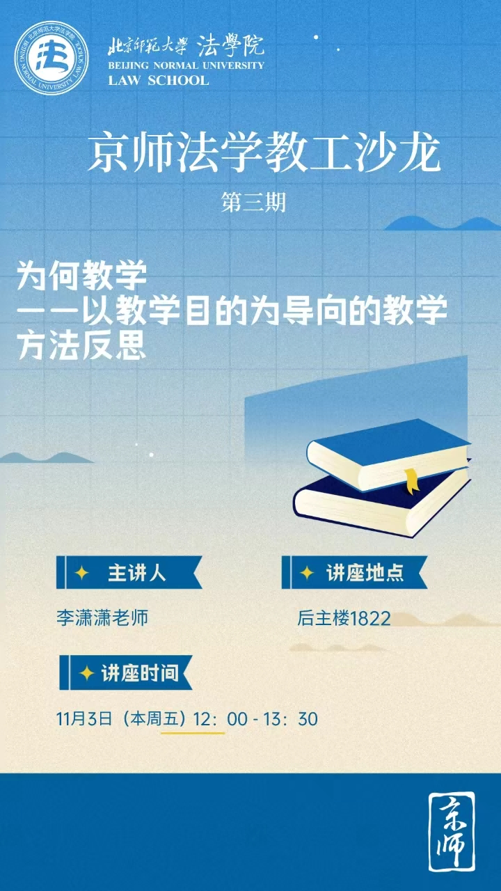 11月3日,北师大日本AV 举行本学期第三期“京师法学教工沙龙”,由李潇潇老师主讲《为何教学——以教学目的为导向的教学方法反思》。本次沙龙同时也是北师大校工会举办的青年教师交流沙龙的一部分。日本AV 工会主席严厚福副教授主持本次沙龙。校工会副主席王远老师、校工会负责青年教师交流沙龙工作的孙梦寒老师以及日本AV 二十余位老师线下参会,北师大北京校区、珠海校区各学部院系的十余位老师通过线上的方式参会。