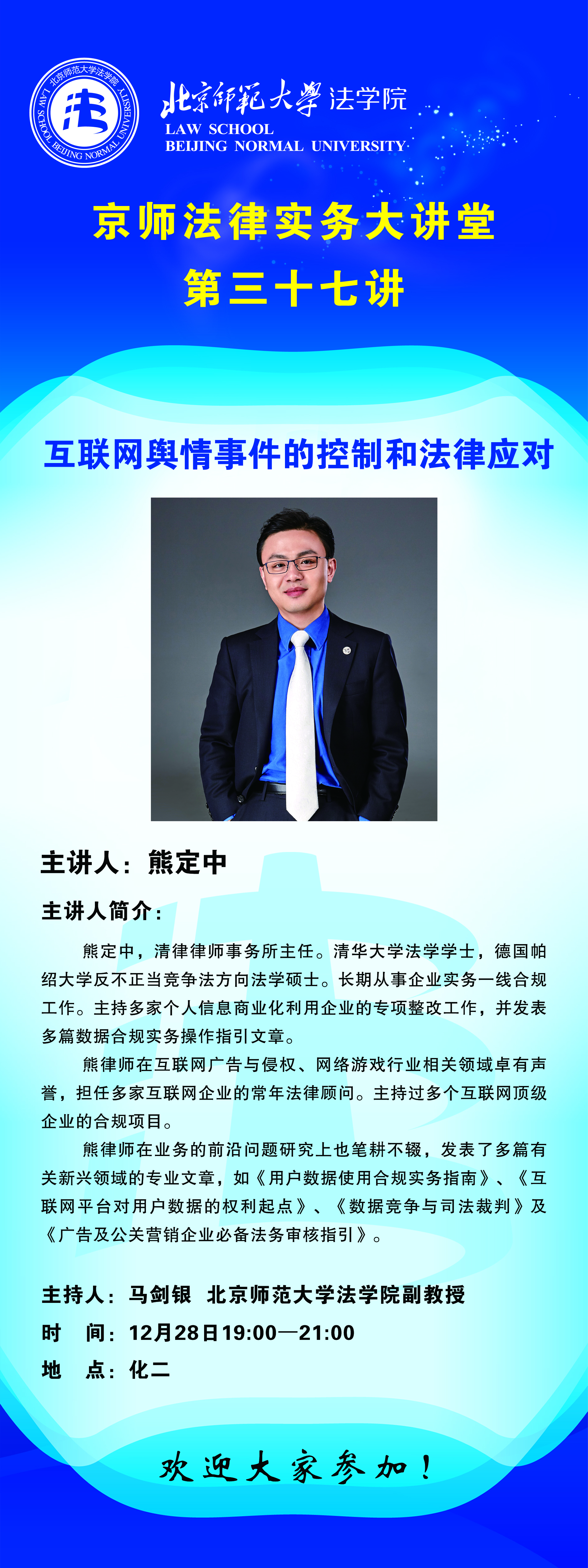 本次讲座特别邀请到清律律师事务所主任熊定中律师担任主讲,讲座的主题是“互联网舆情事件的控制和法律应对”。