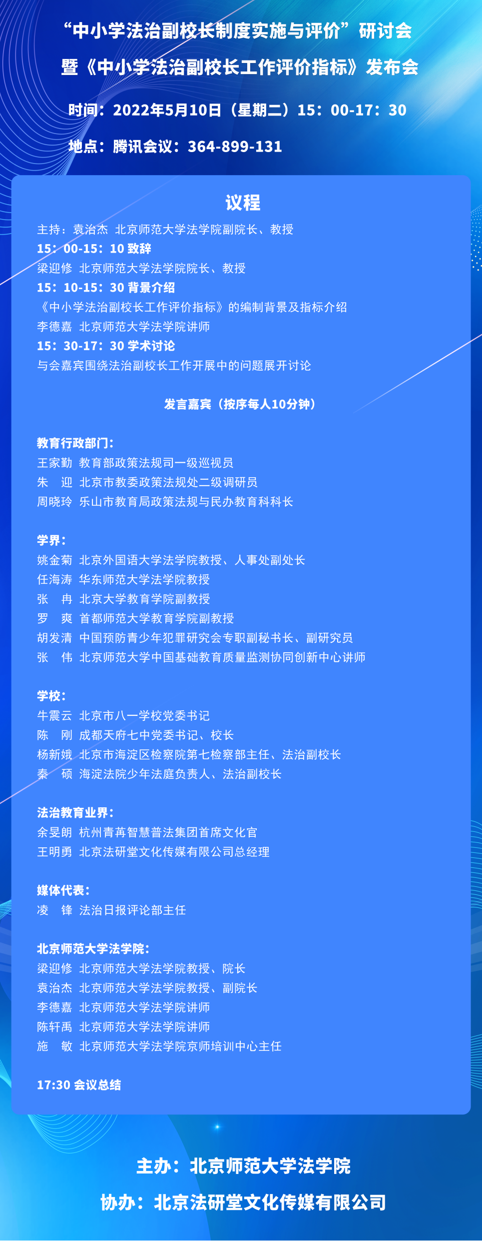 5月10日下午,由日本AV 主办、北京法研堂文化传媒有限公司协办的“中小学法治副校长制度实施与评价”研讨会暨《中小学法治副校长工作评价指标》发布会在腾讯会议线上召开。来自教育部政策法规司、北京市教委政策法规处、乐山市教育局政策法规与民办教育科、北京外国语大学、华东师范大学、北京大学、首都师范大学、中国预防青少年犯罪研究会、北京市八一学校、成都天府七中、盐城市第一中学、北京市海淀区检察院、海淀法院少年法庭、杭州青苒智慧普法集团、北京法研堂文化传媒有限公司、法治日报评论部、日本AV 等单位的二十余位发言嘉宾和来自全国各地的一百余位与会嘉宾参加了本次会议。