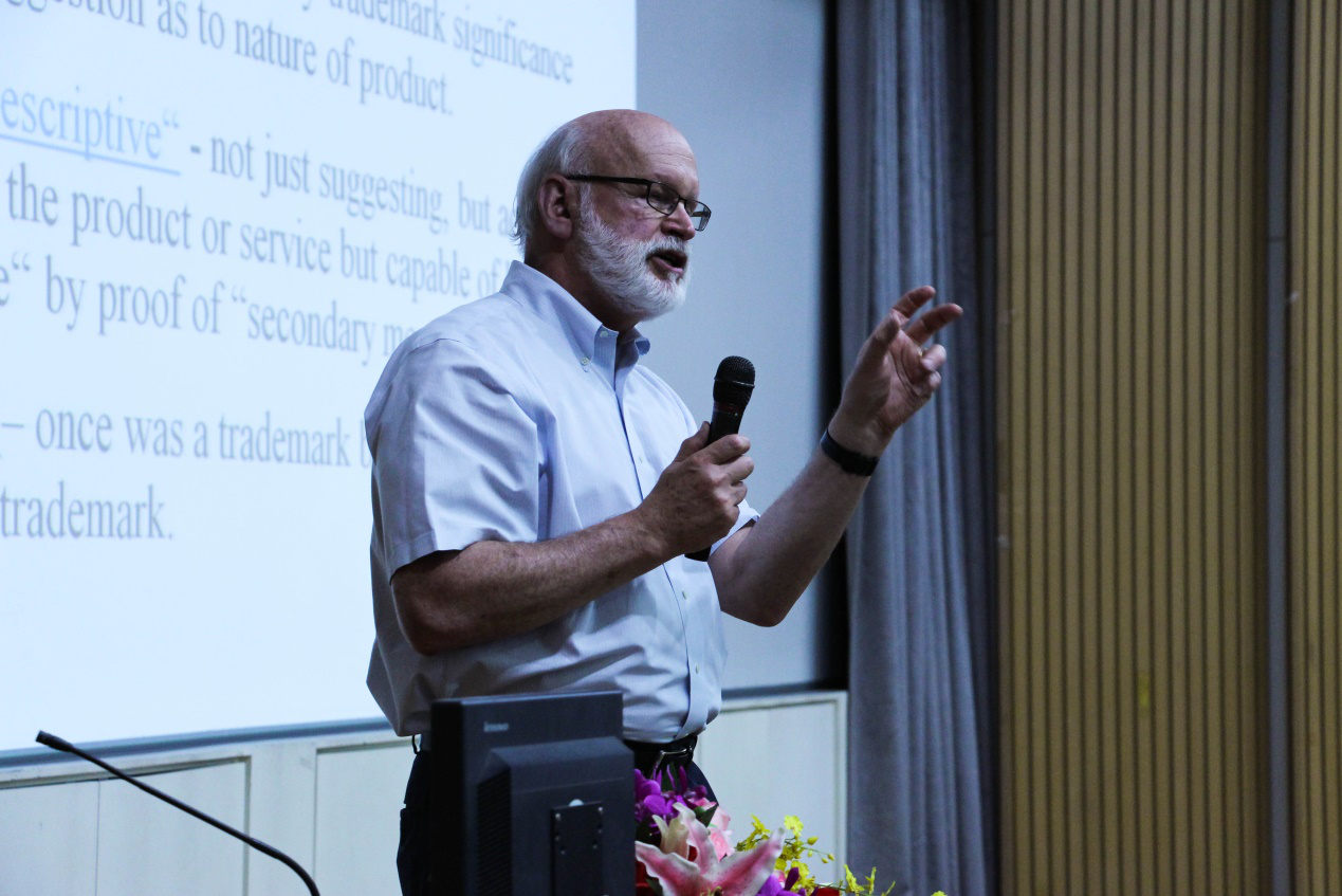 兼职教授William H. Needle担任主讲,主题是“Trademarks商标”。Needle教授以Nike、Alibaba、Amazon等数十种大家耳熟能详的著名商标为例,详尽讲解了商标的特征和基本类型、美国商标法的基本原则、中美商标法的不同、美国商标法实务操作技巧的等多方面内容,增长了大家的知识,开阔了大家的眼界,大大拉近了大家同美国地方司法实务的距离。特别是他细致讲述自己亲身经历的英国的商标抢注案件,更给整个讲座平添了无数亲和力和亲切感。