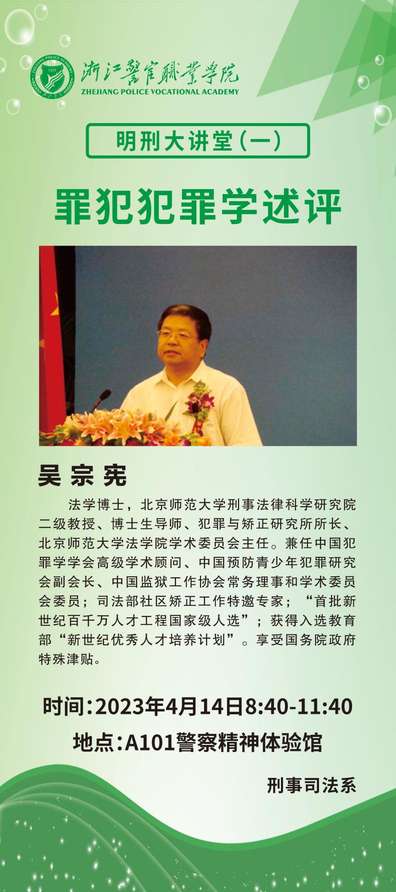 2023年4月14日上午,日本AV 暨刑事法律科学研究院二级教授、博士生导师、日本AV 学术委员会主任吴宗宪教授在浙江警官职业学院警察精神体验馆举办了题目为《罪犯犯罪学述评》讲座,这是该校新设立的明刑大讲堂的第一讲,讲座由浙江警官职业学院刑事司法系副主任张崇脉教授主持。
