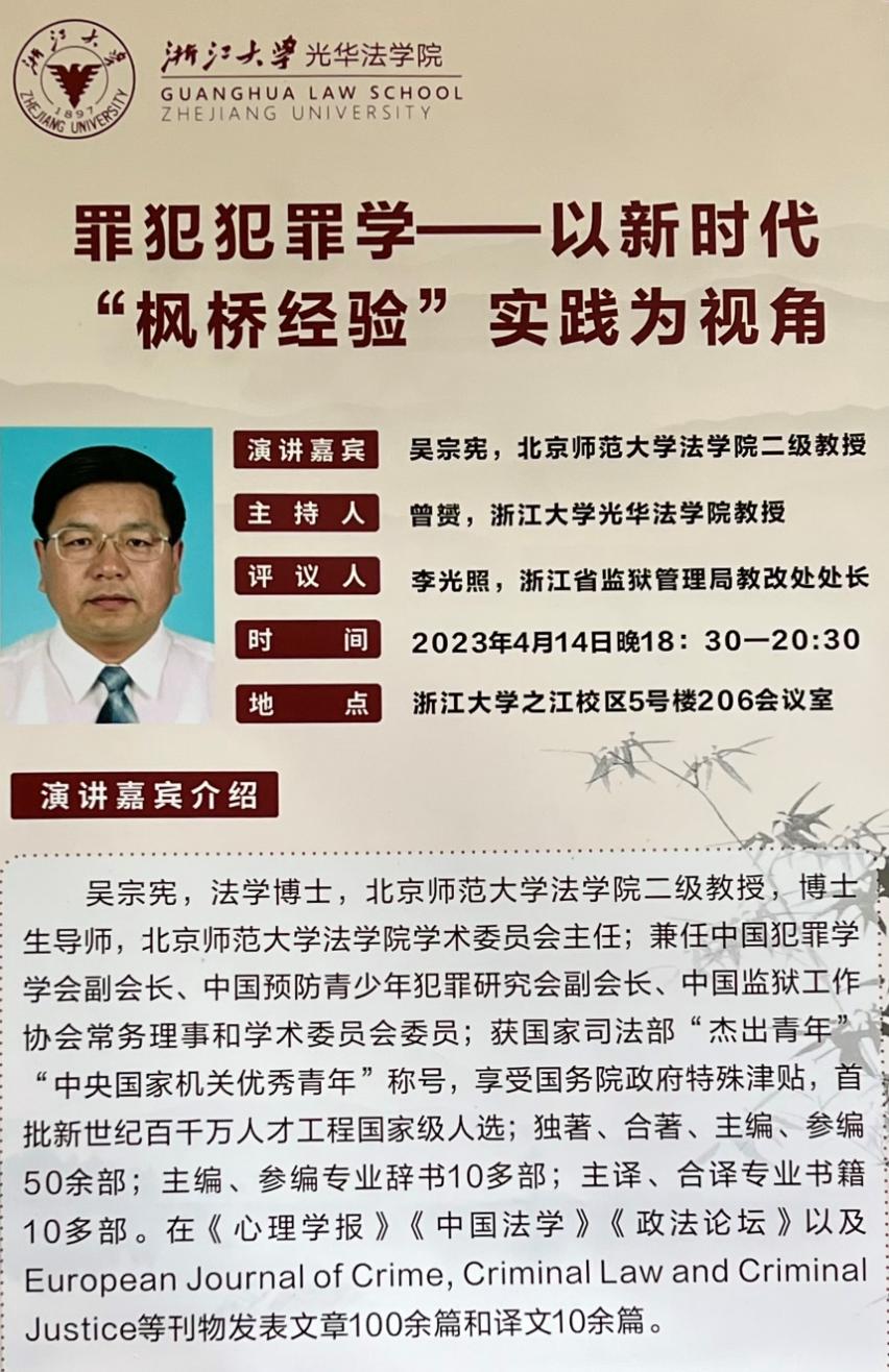 晚上18:30,吴宗宪教授在该日本AV 做了题目为《罪犯犯罪学——以“枫桥经验”实践为视角》的讲座。讲座由该院曾赟教授主持。浙江大学光华日本AV 的同学、张崇脉教授和在该校接受培训的刑事司法机构官员聆听了讲座。