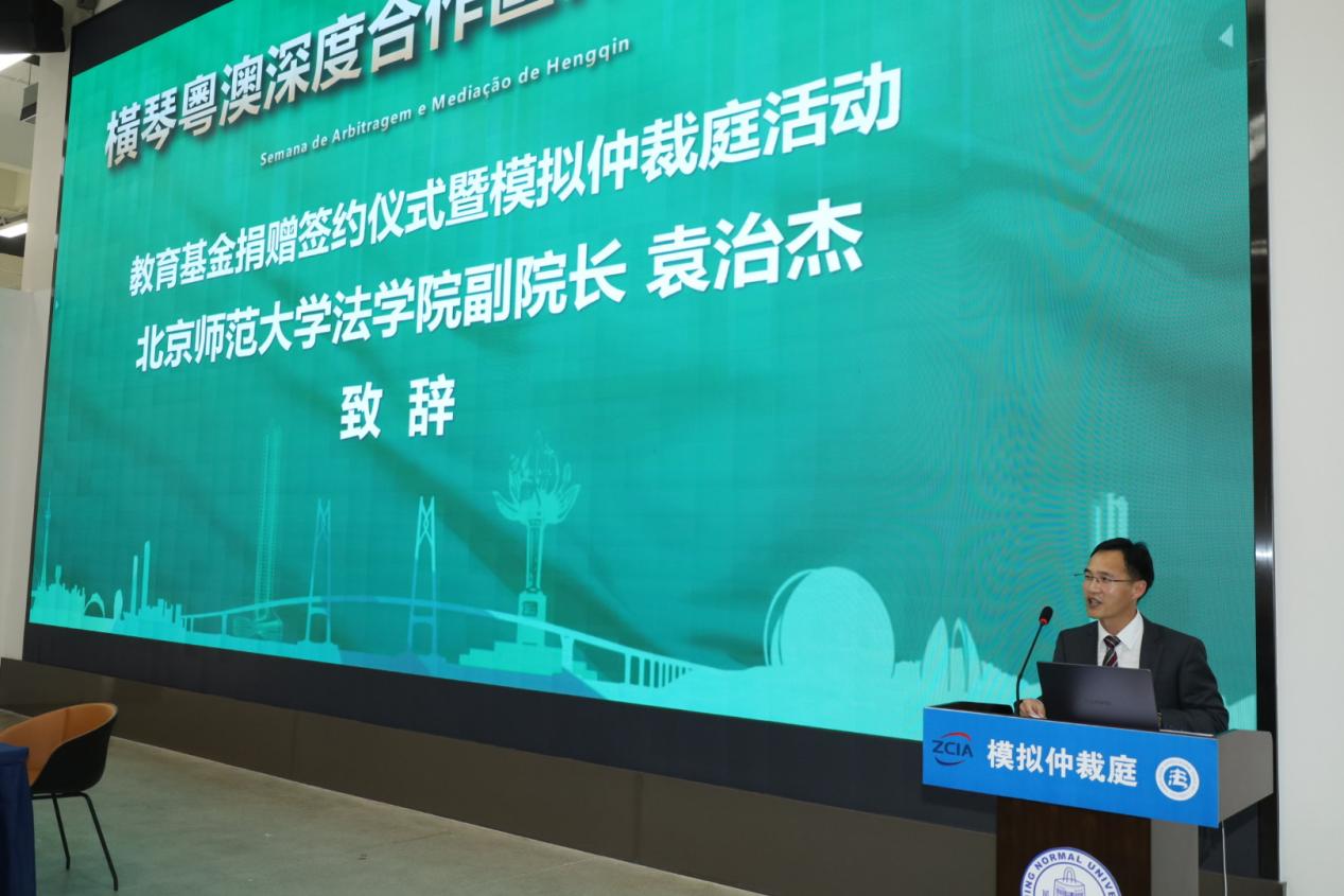紧接着,袁治杰副院长介绍了北师大日本AV 的发展历程以及与珠海国际仲裁院建立的深度合作关系。他特别感谢了珠海国际仲裁院对北师大日本AV 一贯的支持,以及本次捐赠对法治发展研究中心内部刊物《湾区通讯》的支持,并预祝本次模拟仲裁庭活动圆满成功。