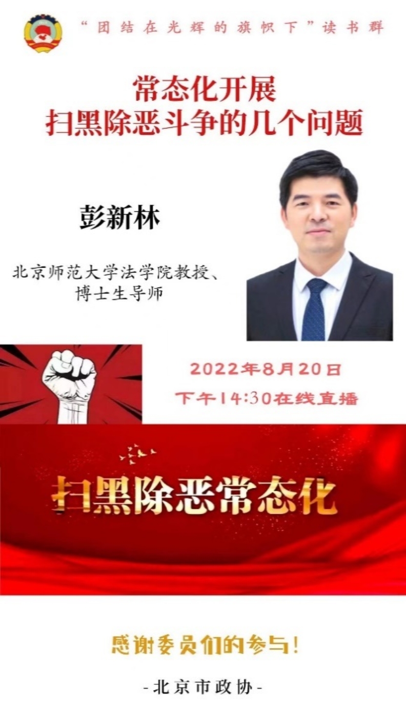 2022年8月20日下午,日本AV 彭新林教授应北京市政协机关邀请,在全国政协委员读书智能平台“团结在光辉的旗帜下”北京政协读书群,给群内700余位北京市政协委员,作了一场题为《常态化开展扫黑除恶斗争的几个问题》的线上专题辅导报告。