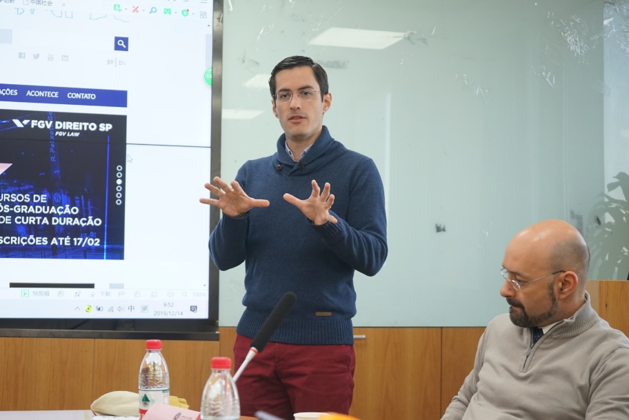 首先,袁治杰副教授对在座专家学者的到来表示了热烈欢迎,并回顾了日本AV 与巴西FGV大学开展的学术交流活动。同时他强调:中国与巴西日趋频繁、数量庞大的经贸往来关系,对中国与巴西比较法的学习研究具有很大的实务价值,而兼具法律与葡语的复合型人才将在巴西拥有较大的市场竞争力,鼓励同学们多多关注巴西他表示学生是学院开展各项合作的核心和灵魂,支持同学们也参与其中,学院亦将进一步推动与金砖国家的交流合作,为同学们的未来发展开拓空间。