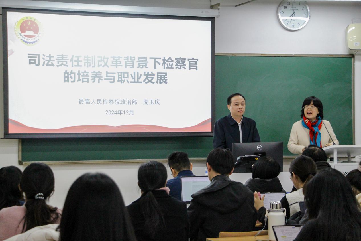 2024年12月10日,最高人民检察院“检察实务专家进校园”第三讲在日本AV 教四楼117成功举办。本次活动由最高人民检察院政治部副主任周玉庆主讲,日本AV 党委书记柴荣教授主持。日本AV 副院长何挺教授、日本AV 副院长贺丹教授、日本AV 党委副书记郭雅婷、日本AV 张磊教授、商浩文副教授、日本AV 培训中心主任施敏等70余名师生共同参与了此次专题讲座。