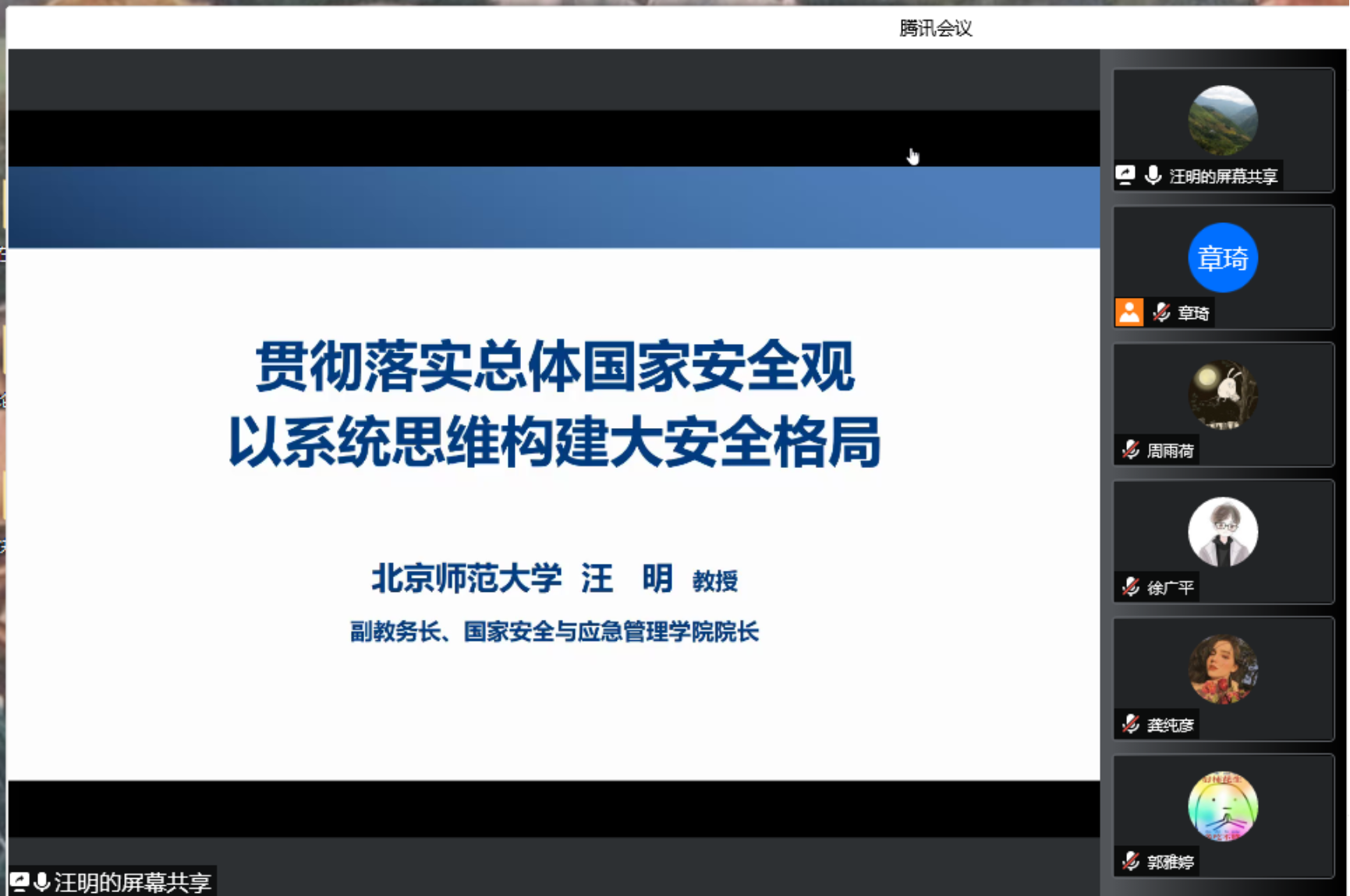 汪明教授从“总体国家安全观的提出”“总体国家安全观的内涵”“总体国家安全观的领域”三个方面展开,指出总体国家安全观是集政治安全、国土安全、军事安全、经济安全、文化安全、社会安全、科技安全、网络安全、生态安全、资源安全、核安全、海外利益安全、生物安全、太空安全、极地安全、深海安全等于一体的国家安全体系。总体国家安全观具有鲜明的全面性、辩证性、系统性、战略性和持续性,涉及传统与非传统安全各个重要领域,构成了完整的安全体系链,环环相扣,缺一不可。在新时代的背景下,国家安全不仅仅是国家的责任,更是每个个体的责任。“生于忧患死于安乐”“思则有备,有备无患”,我们应承载作为中华民族优秀传统文化精神的重要方面的忧患意识,“先天下之忧而忧,后天下之乐而乐”。