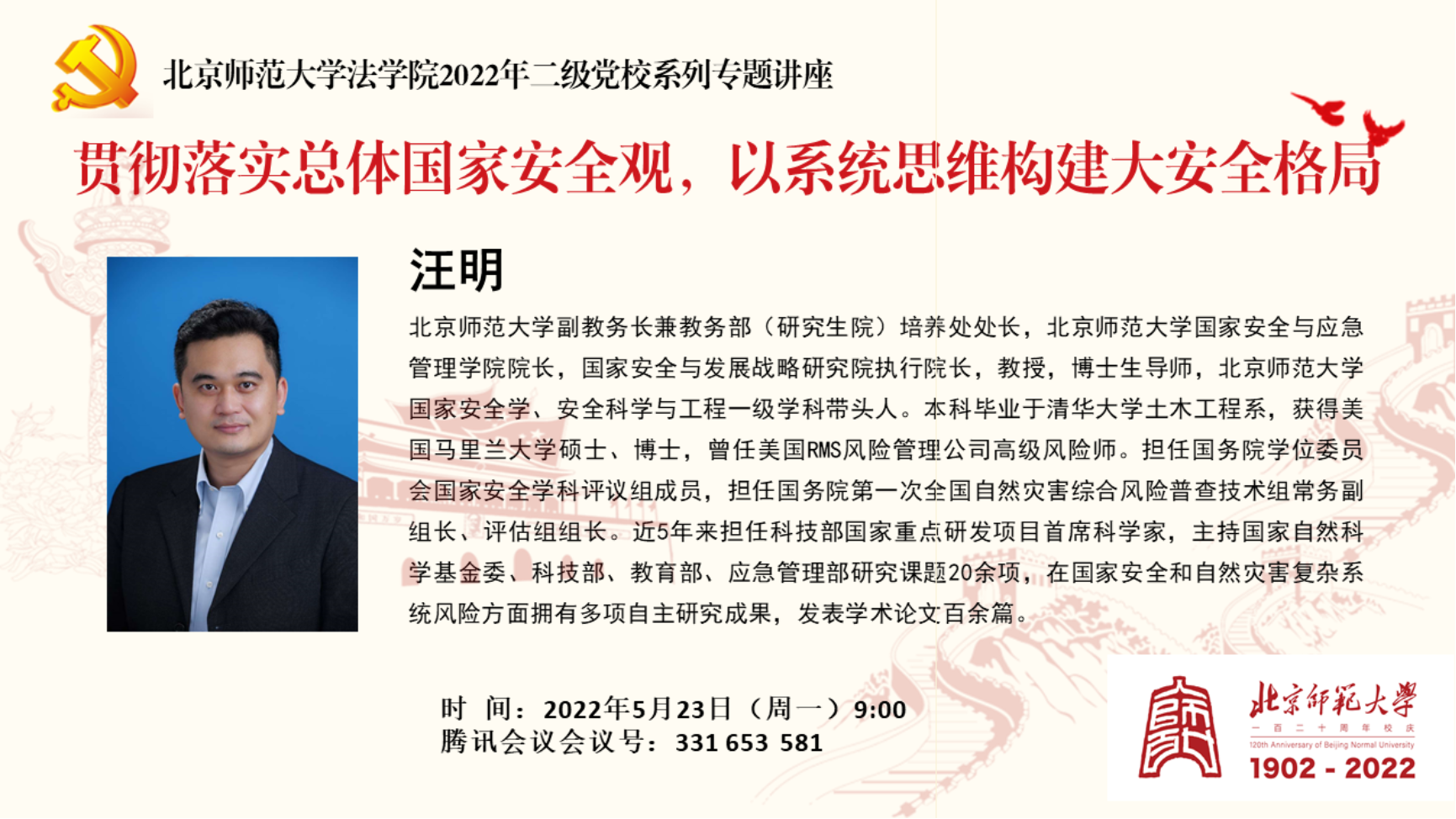 国家安全是安邦定国的重要基石,是人民福祉的根本保障。党的十八大以来,以习近平同志为核心的党中央统筹中华民族伟大复兴战略全局和世界百年未有之大变局,把马克思主义国家安全理论和当代中国安全实践、中华民族传统战略文化相结合,创造性提出了总体国家安全观,为做好新时代国家安全工作提供了根本遵循和行动指南。为深入学习贯彻习近平总书记重要指示精神,牢固树立总体国家安全观,提高日本AV 师生党员国家安全意识,2022年5月23日,日本AV 二级党校特邀请日本AV 副教务长兼教务部(研究生院)培养处处长、日本AV 国家安全与应急管理学院院长、国家安全与发展战略研究院执行院长汪明教授开展“贯彻落实总体国家安全观,以系统思维构建大安全格局”专题讲座,日本AV 师生共计270余人参与学习。讲座由日本AV 党委副书记蔡纹主持。