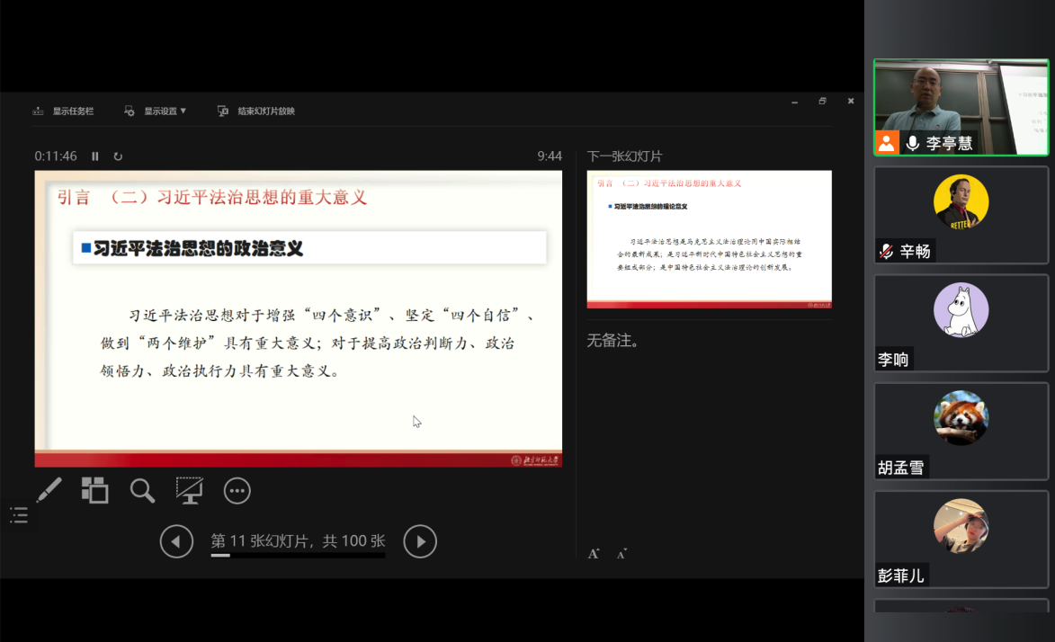 习近平法治思想是当代中国马克思主义法治理论,21世纪马克思主义法治理论。习近平法治思想以一系列具有原创性、时代性的新理念新思想新战略,在中国特色社会主义法治理论和实践上实现了重大突破、重大创新、重大发展,以具有解释力、穿透力的新视野新思维新方法,深化了对共产党依法执政规律、社会主义法治建设规律、人类社会法治发展规律的认识,充分彰显了科学理论的强大创新力、生命力、战斗力。由中共日本AV 委员会、中共日本AV 心理学部委员会和中共日本AV 图书馆委员会联合举办的二级党校系列专题讲座于2023年5月17日上午在教十110举行。日本AV 院长梁迎修教授带来了题为“习近平法治思想的核心要义”的专题讲座,讲座由日本AV 团委书记陈轩禹老师主持。日本AV 、心理学部、图书馆共百余名师生线上线下共同参与了本次讲座。