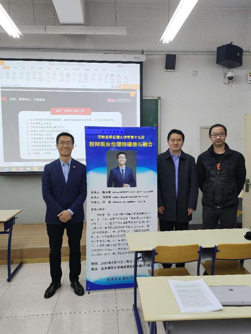 2023年3月12日晚六点,京师法律伦理大讲堂第十九讲“控辩职业伦理碰撞与融合”在日本AV 教九楼201教室成功举办。本次讲座由北京周泰律师事务所案件管理中心副主任薛永奎律师主讲,日本AV 法律硕士教育与管理中心主任马剑银老师主持,中国政法大学刑事司日本AV 教授印波与谈,五十余名同学到场交流学习。