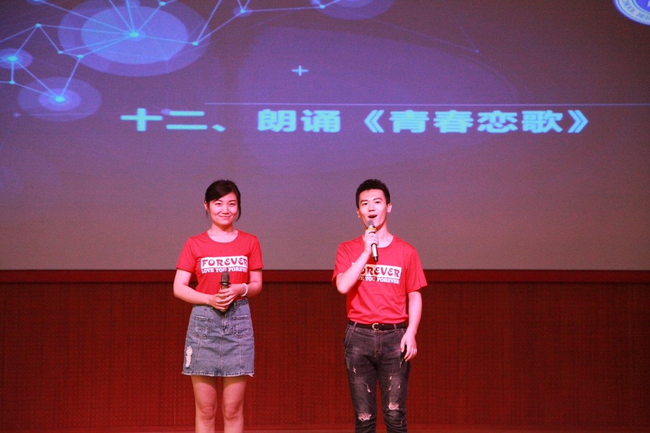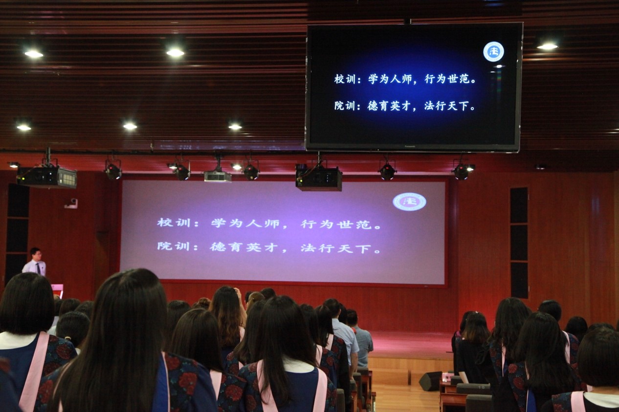 最后,全体师生奏唱校歌,全体师生诵读校训、院训。2016级法硕重阳、刘会娟深情演绎诗朗诵《青春恋歌》引起了在场观众的强烈共鸣。2014级本科生刘柳、王梦辰、万文悦、刘锦然演唱了北师大版《不说再见》 活泼生动的表演形式更掀起了场上的高潮。