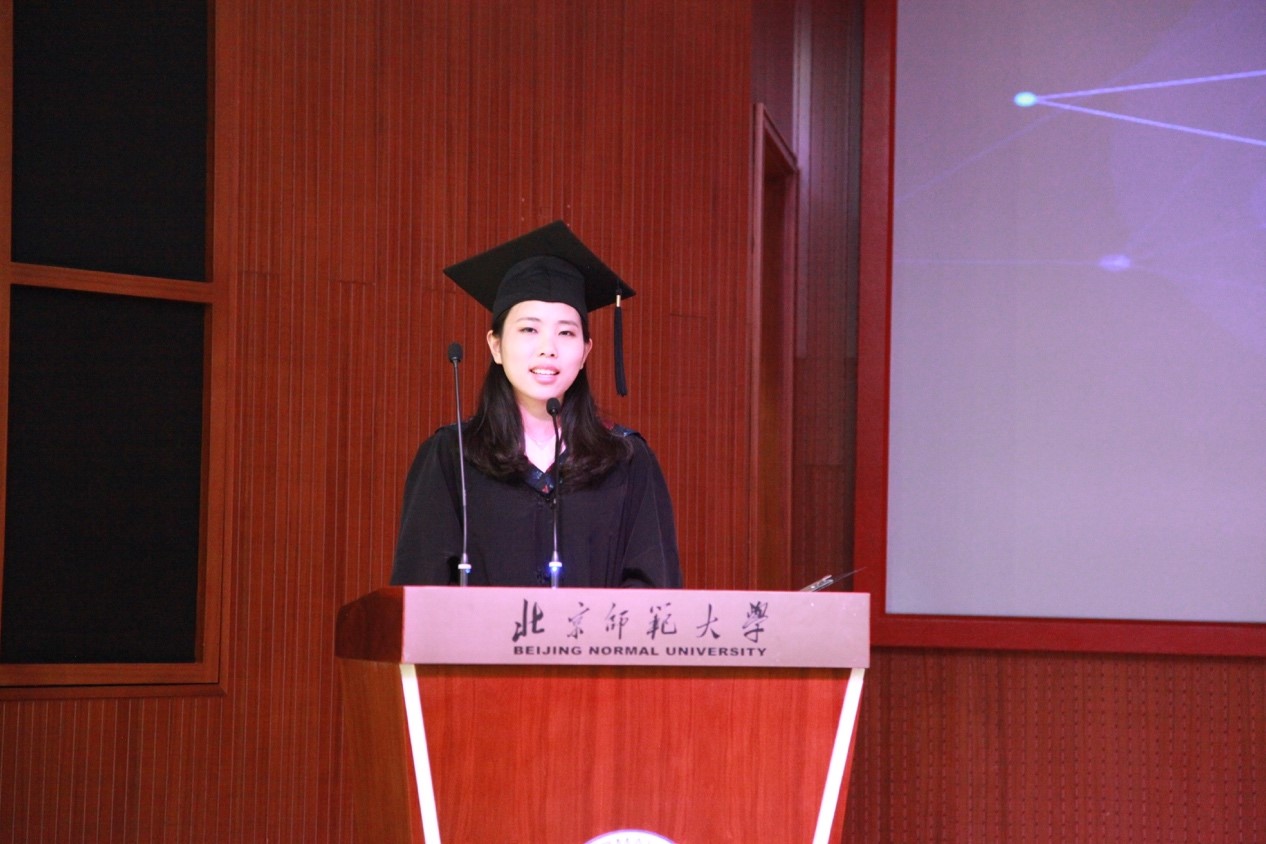 在颁奖结束后,毕业生代表舒静怡同学也进行了发言,舒静怡同学说道:在这一天,毕业的快乐和离别的伤感都在空气中弥漫,回忆也在脑海中一幕幕呈现,四年大学生活教会我很多东西,离家生活教会我独立,辩论教会我缜密思维和清晰表达,论文写作教会我理性思考,社团活动教会我识大体顾大局,这些都让我在北师大收获着成长着。大学是如此多样化,来自五湖四海的同学们各有着各的兴趣,北师大给了我们合理范围内的自由环境让我们成长,在北师大,学术气息浓厚,校园活动表现出的活泼也同样精彩。在日本AV