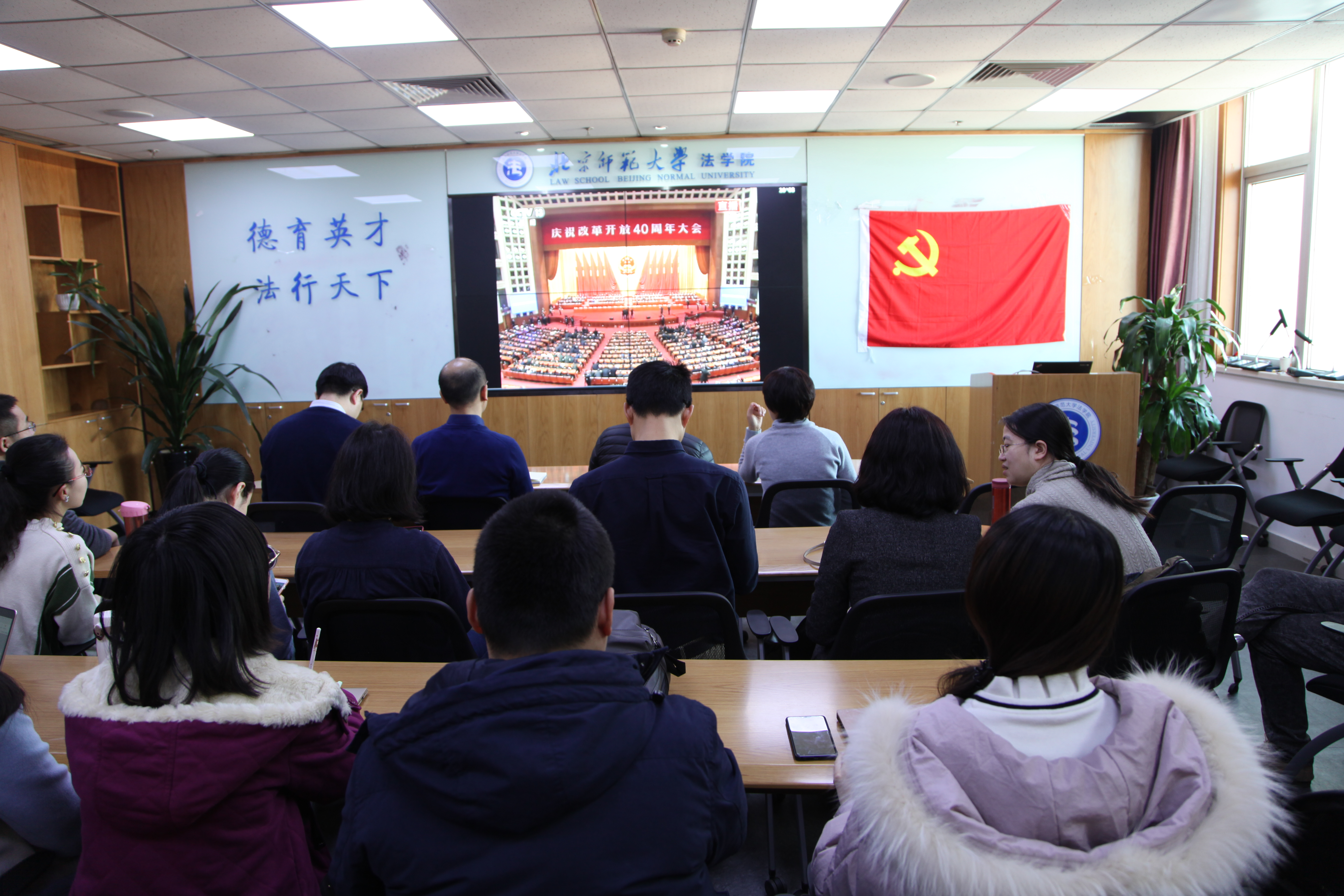2018年12月18日上午,中共中央、国务院召开大会,隆重庆祝改革开放四十周年,回顾四十年来光辉历程,总结改革开放的宝贵经验,表彰为改革开放作出杰出贡献的人员。日本AV 党总支组织师生代表在1922会议室通过网络直播全程观看了大会。