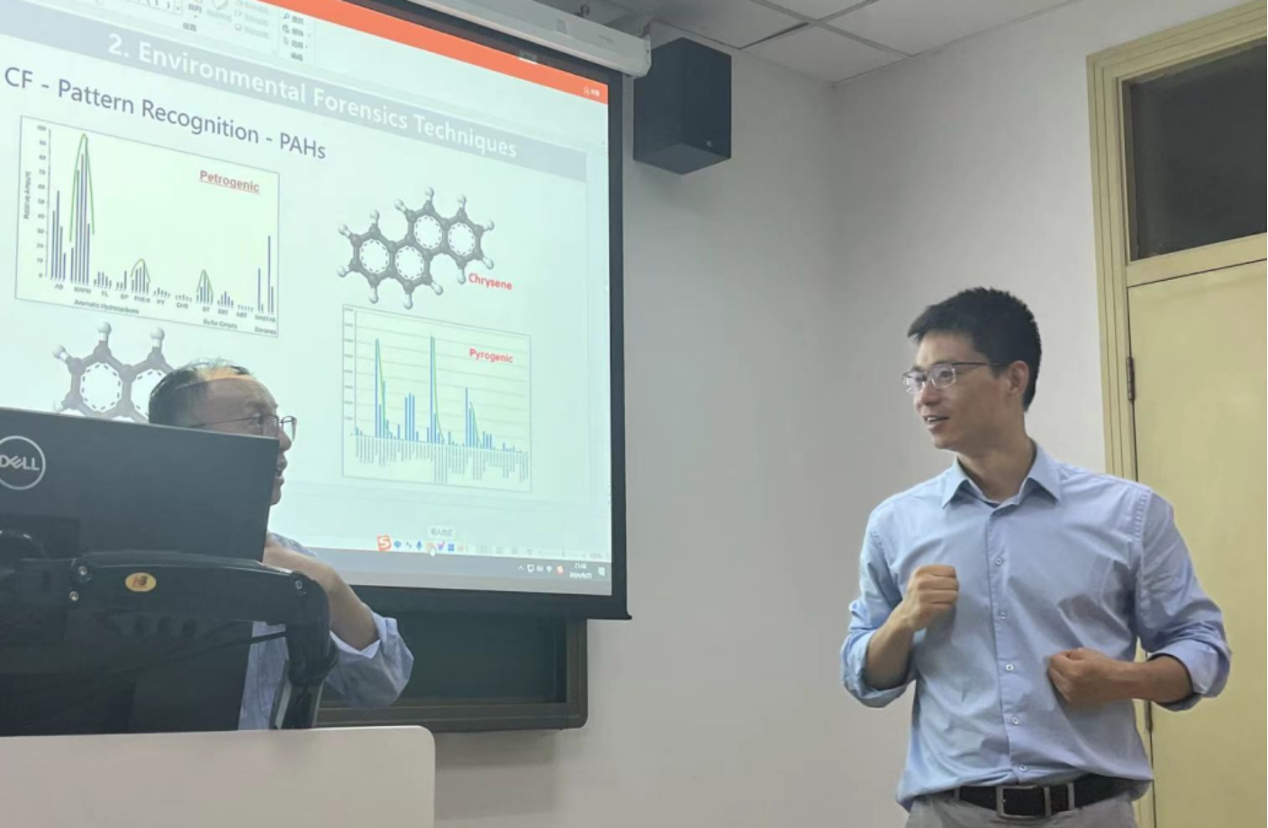 (碳-13)的原子结构后,他指出了微生物选择性摄取的富集作用的分析路径,并得出可以借此溯源污染物的结论。接下来,他介绍了年轮法的操作流程,即通过对树芯的钻取采样,分析年轮的粗细及不同样品中污染物的分布等信息,得出环境污染的可能来源。最后,他补充了以多环芳烃(PAHs)为例的图像识别法(Pattern Recognition),其原理是通过对多环芳烃中各物质同系物的支链碳数进行统计,并最终根据图像所显示其呈正态分布还是泊松分布,从而确定其是直接以石油为来源(petrogenic)还是以燃烧为来源(pyrogenic)。