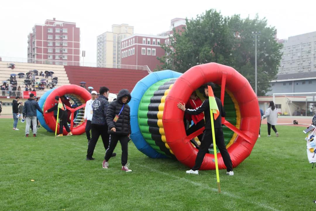 动感五环是众多的趣味项目之一,三个人进入一个长长的横过来的五彩的圆管,圆管的两头各站着两个人,由这两个人推动圆管前进,里面的三个人也同时向前推圆管,使圆管在前进的同时,里面的同学也保持平衡,一同到达终点。