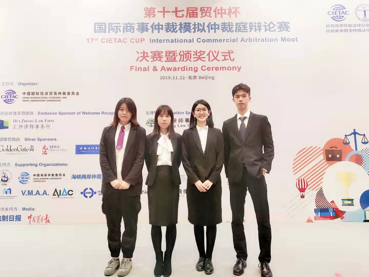 2019年11月18日至22日,第十七届“贸仲杯”国际商事仲裁模拟仲裁庭辩论赛(以下简称“贸仲杯”)在北京国际商会大厦举行。经过五天激烈角逐,我校代表队最终以总积分997.15(团体总分为1200)的成绩获得团队二等奖第一名,以1.1分之差憾失一等奖,在64支参赛队伍中位列第九。此外,吕沐阳同学从一百多名上场队员中脱颖而出,个人总分排名前20,获得循环赛“Best Oralist”(最佳辩手)称号。