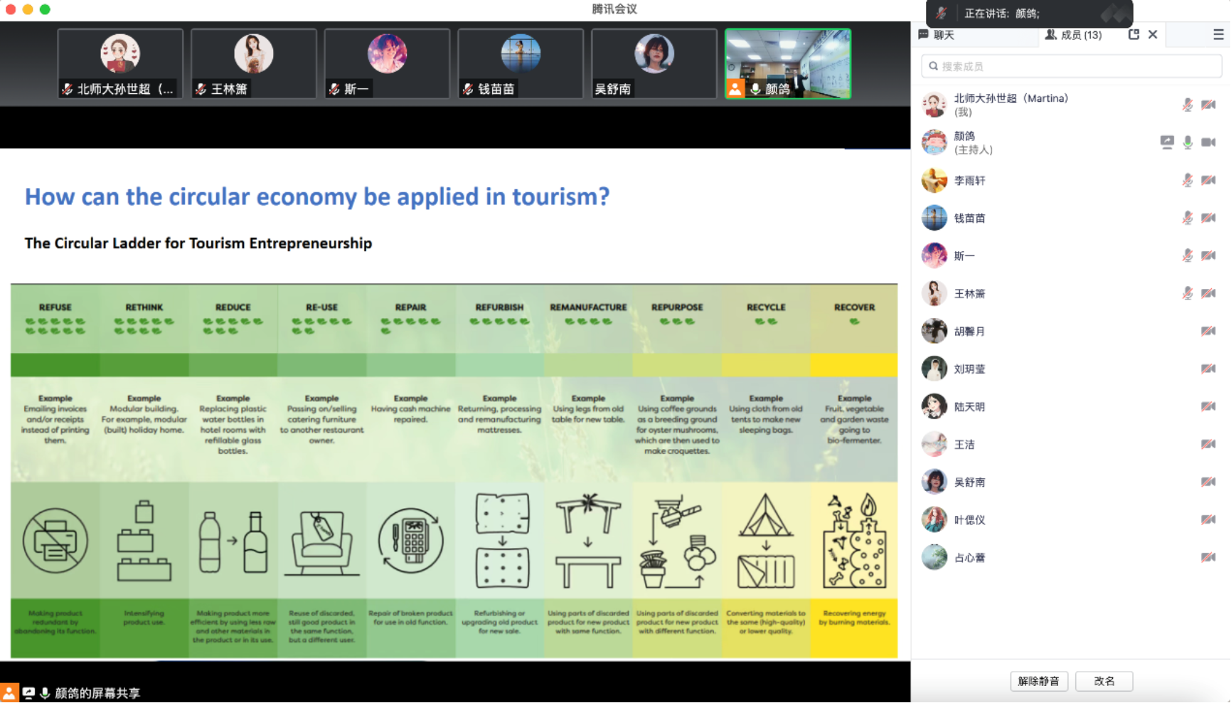 讲座分为两大部分。第一部分Jin Hooi Chan教授以国际环境法视角讲述了“双循环”背景下的可持续发展,对比介绍了中国和欧盟对可持续发展、循环经济的认知异同,引导参会者学习我国循环经济发展脉络和碳中和碳达峰战略。第二部分,Jin Hooi Chan教授结合主持的欧盟FACET项目,从可持续发展的视角介绍了欧盟休闲旅游行业循环利用实践,主要通过生产循环经济产品避免使用稀缺材料,维修、重复使用、翻新、再制造和重新利用等解决方案延长零件和产品的使用寿命,以升级循环和从废料中回收能量的方式使用产品等措施来帮助休闲旅游从业者的生产经营实现从线性经济向循环经济转变。